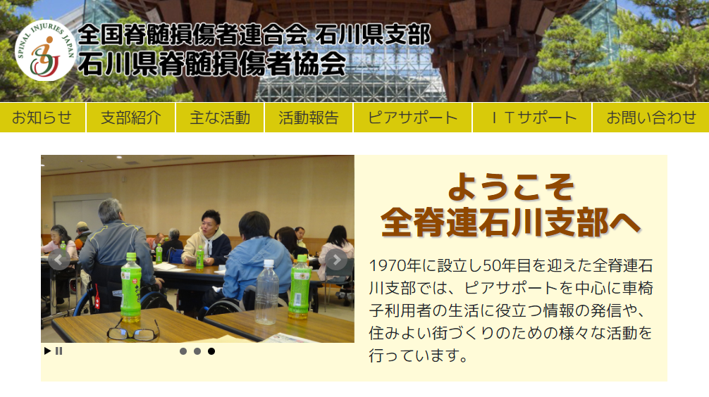 全脊連石川支部では、ピアサポートを中心に車椅子利用者の生活に役立つ情報の発信や、住みよい街づくりのための様々な活動を行っています。